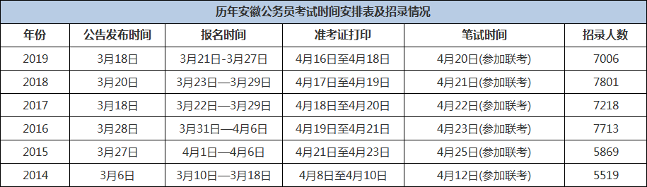 由上表可見,安徽公務(wù)員考試時間比較穩(wěn)定,每年3月中下旬左右出公告和報(bào)名,筆試時間4月中下旬,且近幾年都參加聯(lián)考,所以安徽繼續(xù)參加2020年聯(lián)考的幾率非常大,如果今年繼續(xù)參加(具體時間安排以2020年安徽公務(wù)員公告為準(zhǔn))。