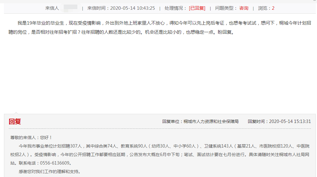 5月14日考生向桐城人社局提問事業(yè)單位招聘情況,以下是詳細內(nèi)容: