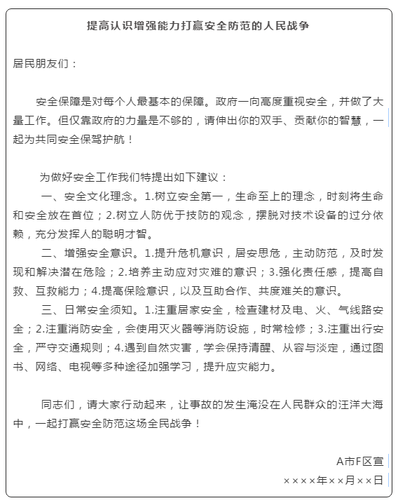 結(jié)語(yǔ):這個(gè)段落主要起號(hào)召作用。當(dāng)交代完所要宣傳的內(nèi)容以后,就要號(hào)召宣傳對(duì)象來(lái)落實(shí)踐行所宣傳的內(nèi)容,這樣的話,宣傳稿才算完整。