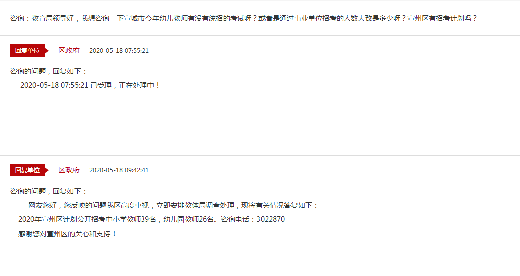 5月18日,有網(wǎng)友在宣城市人民政府互動(dòng)交流平臺(tái)提問(wèn):教育局領(lǐng)導(dǎo)好,我想咨詢(xún)一下宣城市今年幼兒教師有沒(méi)有統(tǒng)招的考試呀?或者是通過(guò)事業(yè)單位招考的人數(shù)大致是多少呀?宣州區(qū)有招考計(jì)劃嗎?宣城市宣州區(qū)政府給出了如下回復(fù):2020年宣州區(qū)計(jì)劃公開(kāi)招考中小學(xué)教師39名,幼兒園教師26名。更多安徽教師招聘咨詢(xún),請(qǐng)關(guān)注2020年淮北教師招聘考試網(wǎng),后續(xù)會(huì)持續(xù)更新!