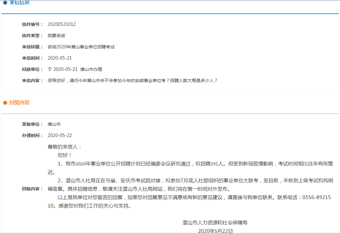 來信內(nèi)容:領(lǐng)導您好,請問今年潛山市會不會參加今年的安徽事業(yè)單位考?招聘人數(shù)大概是多少人?