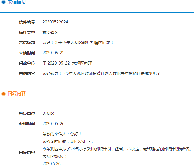 來信內容:您好領導! 今年大觀區(qū)教師招聘計劃人數比去年增加還是減少呢?