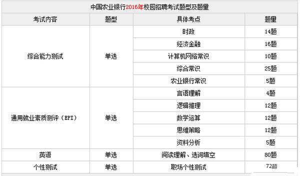 下圖為2016年農(nóng)業(yè)銀行校園招聘考試題型及題量,考生可做參考。
